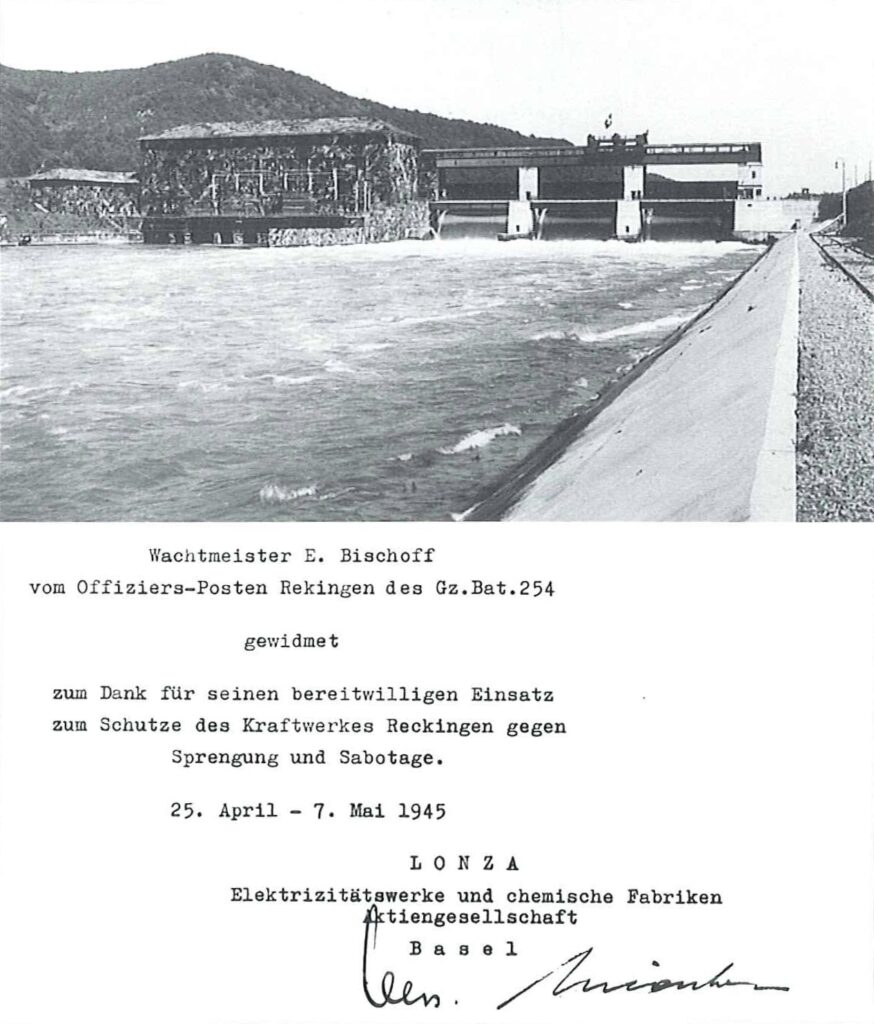 Nach Baubeginn 1938 wurde das Kraftwerk im Jahre 1941 in Betrieb genommen. Ohne Frage war es eine Herausforderung, dieses Projekt inmitten des zweiten Weltkrieges zu realisieren. Dazu kommt, dass das Kraftwerk Reckingen eines der ersten Kraftwerke im Rhein war, das quer zum Rhein gebaut wurde – für damalige Verhältnisse ein großes Wagnis.